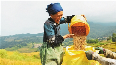 哈尼人恪守着古老的红米种植传统,不依赖化肥,保持红米的自然特性,通过河流、沟渠引高山泉水灌溉,自上而下冲灌到层层梯田中。独特的“三犁三耙”“夏秋种稻  冬春涵水”“人工耕耘除草”等精耕细作技术体系,使元阳梯田出产的红米具备了“原生态、原产地、原种群”3大特性。下转第二版  上接第一版
