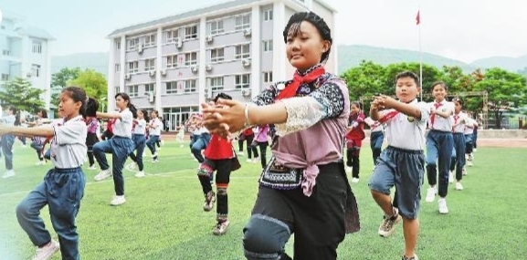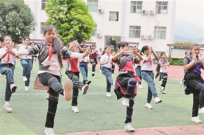 近年来,元阳县各中小学不断创新形式,大力弘扬“天人合一、自强不息”的哈尼梯田精神,将传统文化、民族舞蹈、地域文化等元素融入学校课间操,编排出了风格各异的民族课间操,持续铸牢中华民族共同体意识,促进学生德智体美劳全面发展。