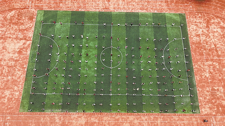 上午10点,课间操时间一到,元阳县南沙镇中心小学的同学们迅速集合,在操场上有序站成方阵。无人机从空中俯瞰,整个操场仿佛变成了一个色彩斑斓的民族文化大舞台。只见同学们身着鲜艳的民族服饰,伴随着欢快的民族音乐,或舒展手臂,或旋转跳跃,跳起融合民族舞元素的课间操。每一个动作都充满了力量与美感,展现出哈尼族舞蹈的独特魅力。