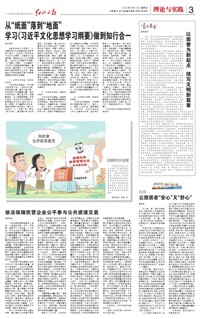 - 从“纸面”落到“地面” 学习《习近平文化思想学习纲要》做到知行合一 ●刘伯焘 在百年未有之大变局下,以中国式现代化全面推进中华民族伟大复兴,必须深入贯彻落实习近平文化思想,以推进文化自信自强,铸就社会主义文化新辉煌。《习近平文化思想学习纲要》(以下简称《纲要》
