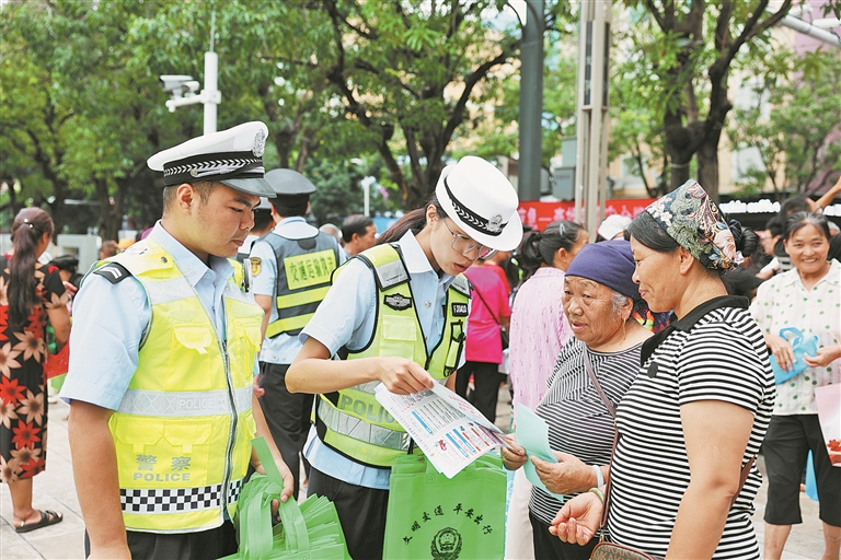 6月16日,元阳县在人民广场开展“安全生产月”宣传活动,通过摆放展板、现场讲解答疑、发放宣传资料等方式,为群众讲解各类安全知识,增强公众安全意识。图为工作人员向群众宣传交通安全知识。