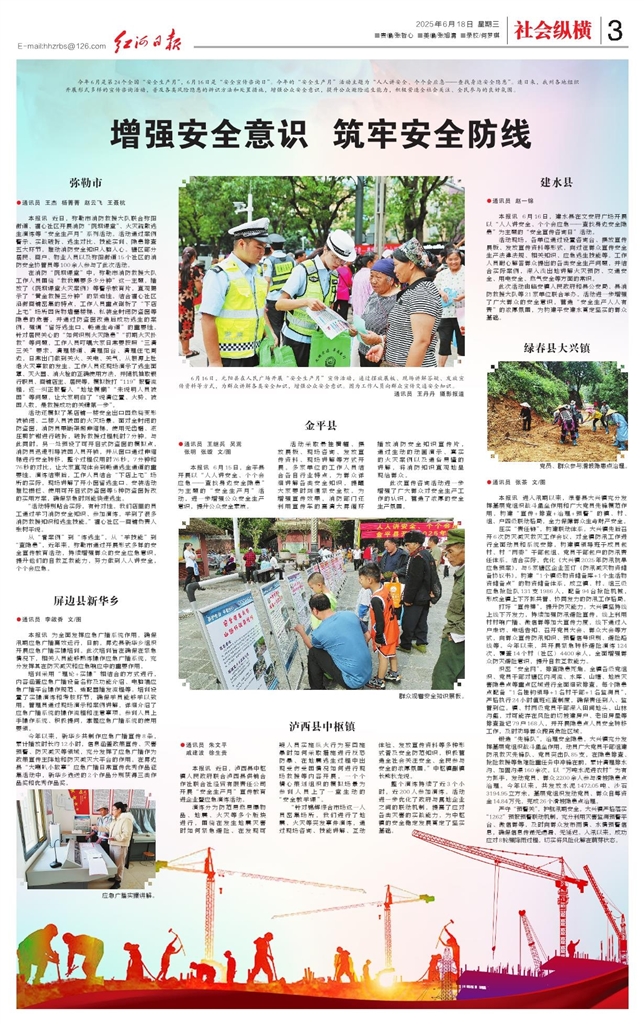 本报讯 6月15日,金平县开展以“人人讲安全、个个会应急——查找身边安全隐患”为主题的“安全生产月”活动,进一步增强公众安全生产意识,提升公众安全素质。