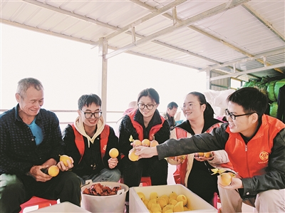 此前,强对流天气突袭,黄茅岭乡七彩热情果种植基地遭冰雹与暴雨侵袭,成熟的果实挂在枝头摇摇欲坠,部分枝叶被砸得残破不堪。得知基地急需人力抢收,黄茅岭乡组建党员志愿助农小分队,到黄茅岭乡七彩热情果分拣中心帮助农户进行拣果、套袋、装箱、直播售卖等。
