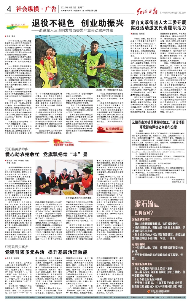 - 退役不褪色 创业助振兴 ●记者 李彬 2003年12月,汪泽明从武警某部退役后,创立了俩佬兵农业技术开发红河有限公司,采取“技术赋能、资源联动、品牌升级、长效发展”4条路径,发展百香果产业,打造乡村振兴样板,不仅带