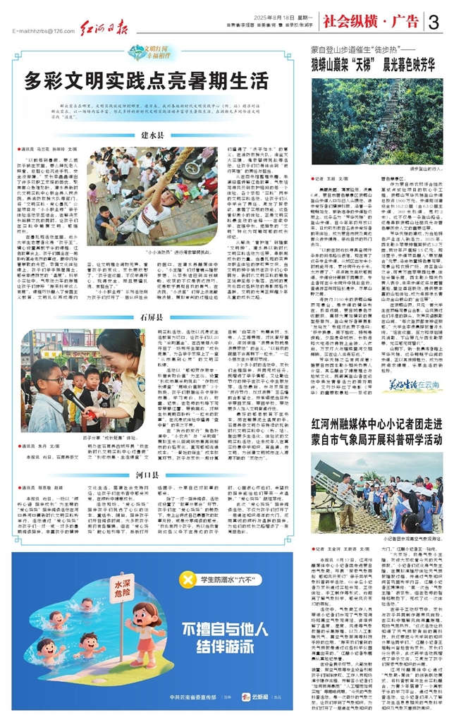- 红河州融媒体中心小记者团走进蒙自市气象局开展科普研学活动 ●记者 王金河 王新语 文/图 本报讯 8月17日,红河州融媒体中心小记者团走进蒙自市气象局,开展“探索气象奥秘 感知风云变幻”亲子共学气象科普研学活动。60余名小记者及家长通过实地参观、互动