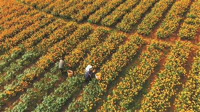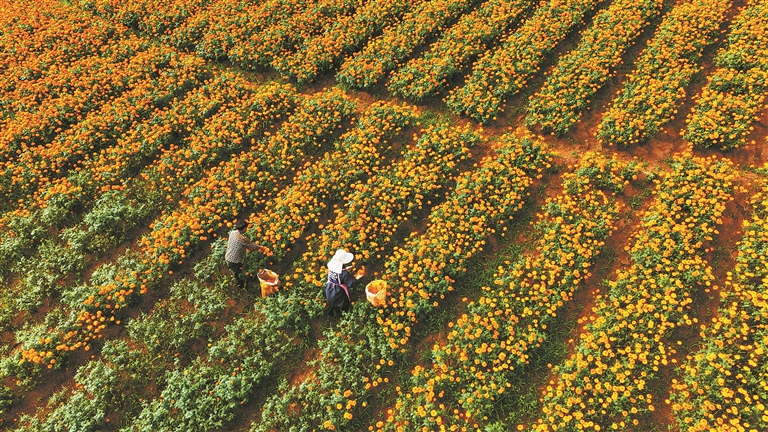 眼下,走进开远市灵泉街道,连片的万寿菊竞相绽放,远远望去,翠绿的山间仿佛披上了橙色的地毯。近年来,灵泉街道充分发挥资源优势,在西山片区积极发展万寿菊产业。2025年,灵泉街道种植万寿菊1.4万亩,预计产量达2.1万吨,产值超2500万元。图为种植户在采收万寿菊。通讯员 张洪科 摄影报道