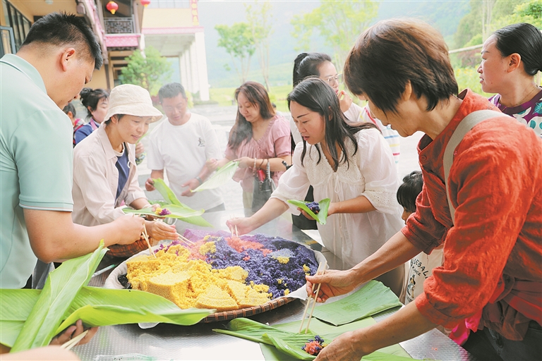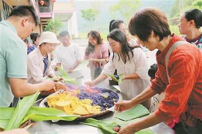 近日,屏边县举办壮家花米饭生态文化体验活动,紫蓝草、密蒙花等植物染料在壮家阿姐的巧手中“摇身一变”,成为花米饭绚丽的“外衣”。近年来,屏边县通过深挖民族文化富矿,将传统技艺与现代文旅理念相结合,推动文旅融合。图为游客在品尝软糯香甜的花米饭。