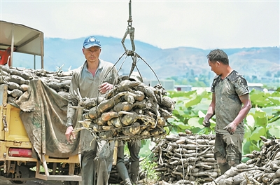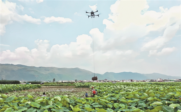 连日来,弥勒市竹园镇1.7万亩莲藕丰收,无人机吊运鲜藕助力采收。据悉,无人机吊运莲藕仅是弥勒市发展低空经济的一个缩影。该市依托完备的基础设施,构建起低空经济全产业链,成为全国第二大轻型飞机生产基地,其应用已覆盖农业、文旅、应急救援等多个领域。图为无人机吊运莲藕。