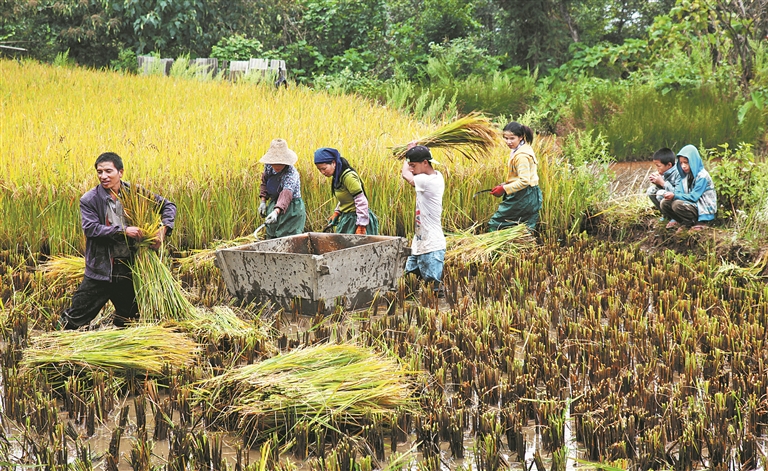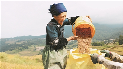 在元阳县粮食购销有限公司牛角寨红米加工厂的车间里,米香混着蒸汽飘出老远。一盒盒印着“千年梯田 古韵留香”标识的红米酒礼盒整齐地摆放在货架上,一旁的红米糊、红米饼、红米茶等10余种产品码得整齐。“以前红米只是自家的口粮,现在做成这些深加工产品,身价涨了不少。”该公司负责人李文荣拿起一瓶红米酒,标签上的梯田图案清晰可见。
