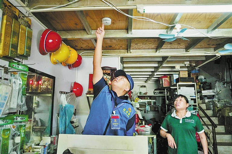在现场,防消联勤小组针对场所特点,为存在隐患的住户免费安装智能烟感报警器。“设备一旦检测到烟雾,会立即发出警报,实现‘早发现、早处置’。”防消联勤小组带队干部蔡孟洋一边调试设备,一边向店主讲解使用方法。