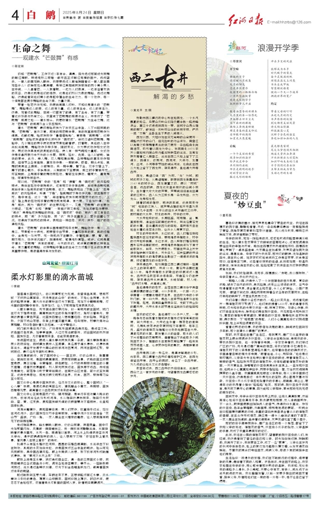 - 夏夜的“炒豆虫” ◎童石磊 暮色似浓稠的墨汁,悄无声息地晕染了蒙自的天空。我站在四孃家的院子里,静静地看着,天边一朵朵晚霞将最后一抹胭脂揉进了黄昏,院角紫薇花簌簌抖落紫纱裙裾。风从远处吹来,蝉鸣忽然稀疏下来,像