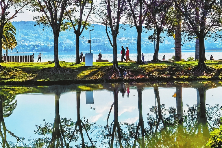 每天傍晚,湖泉生态园内的便道上聚集着上千名休闲散步的游客。69岁的四川旅居客周永红,2006年退休后便来到弥勒旅居。每天晚饭后,他都会和老伴到湖边打太极拳,感受小城的静谧与美好。“我到弥勒快9年了,这里气候好、生活成本低,我们在这里买了房,已经定居在弥勒了。”周永红说。