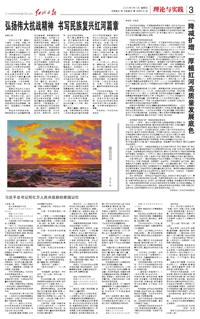 - 弘扬伟大抗战精神 书写民族复兴红河篇章 ●董云娟 历史川流不息,精神代代相传。80年前,中国人民以血肉之躯筑起抵御外侮的钢铁长城,谱写了气壮山河的英雄史诗;80年后,伟大抗战精神依然闪耀着时代光芒,激励着中华儿女在民族复兴的征程上奋