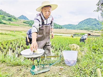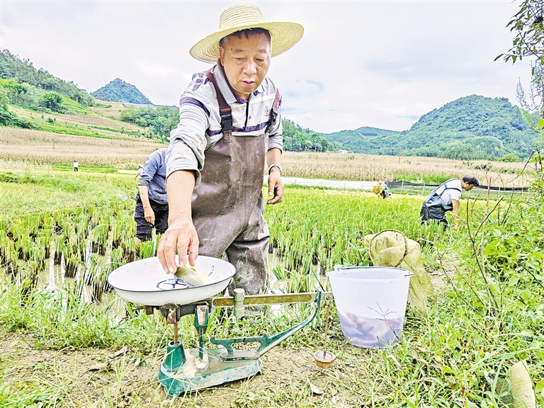 “亩产约50公斤鲜鱼,按40元一公斤算,一亩多挣近2000元。”六塘子村民小组村民邓文友笑容满面地算起收益账。更让他惊喜的是,稻田里的稻谷较常规种植增产2%,农药、化肥使用量还减少了大半。当天,在测产田边,打谷机轰鸣,村民正抢抓利好天气收割稻谷。