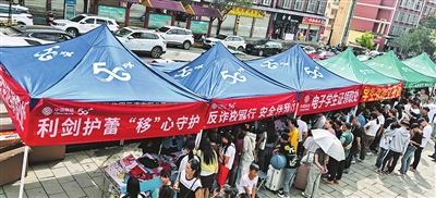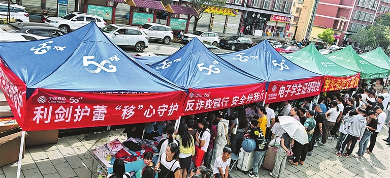 线下阵地摆摊设点。校内主干道旁,蓝色帐篷上,“反诈校园行 安全伴我行”一字排开,横幅高悬、展板成排,移动公司工作人员将1万余份图文并茂的宣传册递到新生手中,覆盖师生超9000人。常见骗局、防范口诀、举报路径一目了然。