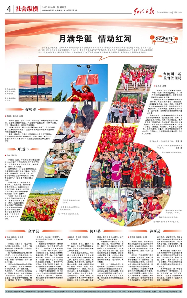 金秋送爽,丹桂飘香。在中华人民共和国76周年华诞与传统中秋佳节来临之际,红河大地处处洋溢着“双节”同庆的喜悦氛围。各地精心筹备,以丰富多彩的文化活动抒发家国情怀。与此同时,各部门早已开启“双节”护航模式:交通战线严查路网保畅通,市场监管部门深入商超稳供应……传统与现代交织,温情与坚守同行。这份红河独有的“双节”画卷,既承载着对国泰民安的深情礼赞,又寄托着对万家团圆的美好祝愿。