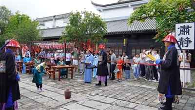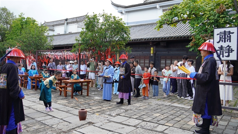 “节日期间,我们精心打造科举院试情景体验等6项核心活动,让游客通过沉浸式参与,全面了解科举制度的历史脉络。”建水学政考棚景区管理有限公司总经理李倩介绍,在体验活动中,儿童化身“古代考生”,在学政大人的引导下,完整体验考前搜身检查、进入考场作答等科举流程,感受古代学子的备考场景,家长们纷纷用镜头记录这一兼具教育意义与文化氛围的瞬间。