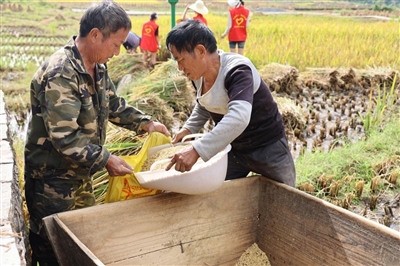 秋日,金平县马鞍底乡稻穗摇曳,稻香漫溢,“秋收志愿队”深入田间帮助农户收割稻谷。据测算,今年全乡水稻亩产近500千克,总产值有望突破新高。图为农户将稻谷装袋。