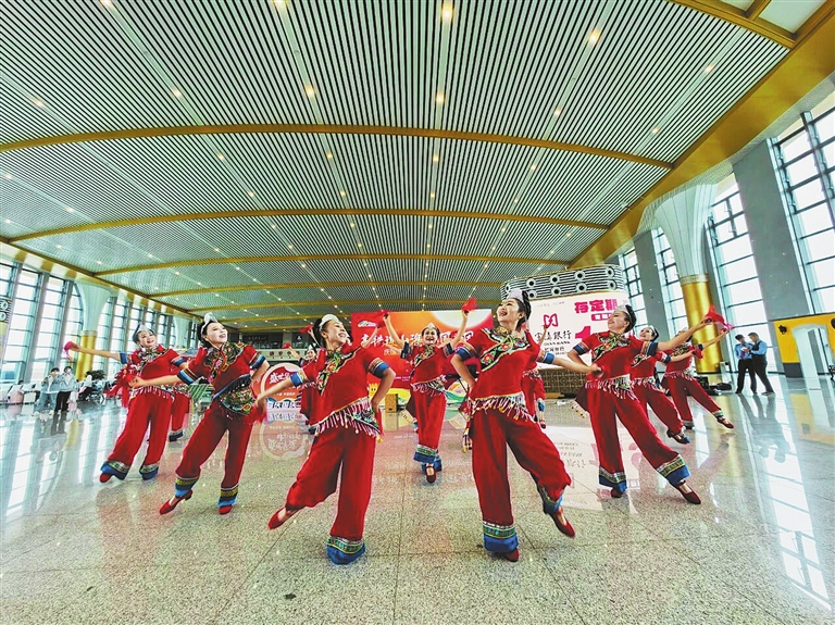 “山上开的马缨花,哪个最爱她……”身着绚烂花腰彝服饰的舞者翩然现身,绣纹流转、裙摆飞扬,在候车大厅玻璃幕墙的映衬下,构成传统与现代交融的生动画面,吸引众多旅客驻足欣赏。马缨花、烟盒舞……伴随着欢快的旋律,富有红河州民族特色的节目轮番上演,不少旅客举起手机记录精彩瞬间。