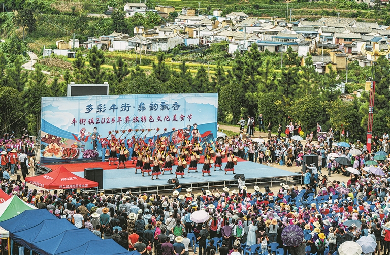 近日,石屏县牛街镇举办“多彩牛街·彝韵飘香”彝族特色文化美食节,展示该镇多彩的民族文化及美食,进一步推动农文旅融合发展。 图为文艺展演现场。