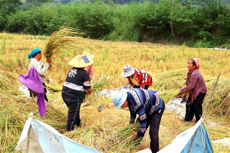 连日来,金平县老集寨乡的田野铺满金黄。微风拂过,空气里满是清甜的稻香,沁人心脾。农户们在田间地头忙活,脸上洋溢着喜悦的笑容,动作间透着丰收的满足。大图为农户搬运稻穗。小图为颗粒饱满的稻穗。