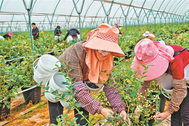 初冬时节,新哨镇某企业蓝莓种植基地内,连片蓝莓在阳光下熠熠生辉。清风拂过,蓝紫色的浆果饱满透亮,散发着清甜的香气。“通过智慧农业系统培育的蓝莓,从种植到采摘全程标准化管理,糖度达14度至16度,国内各大市场供不应求。”基地技术人员介绍,采摘后的蓝莓经冷链包装,24小时内即可送达上海、广州等城市商超,部分高端品种还出口泰国、越南等国家。