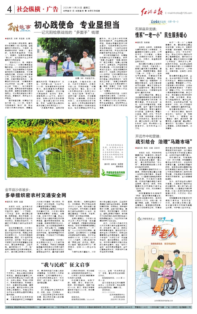 - 多举措织密农村交通安全网 ●通讯员 杨玥 金鑫 本报讯 近日,金平县沙依坡乡启动农村道路交通安全百日攻坚行动,锚定“一个下降和一个不发生”目标,通过高位部署、隐患排查、常态劝导等一系列举措,扎实推进百日攻坚行动走深走实