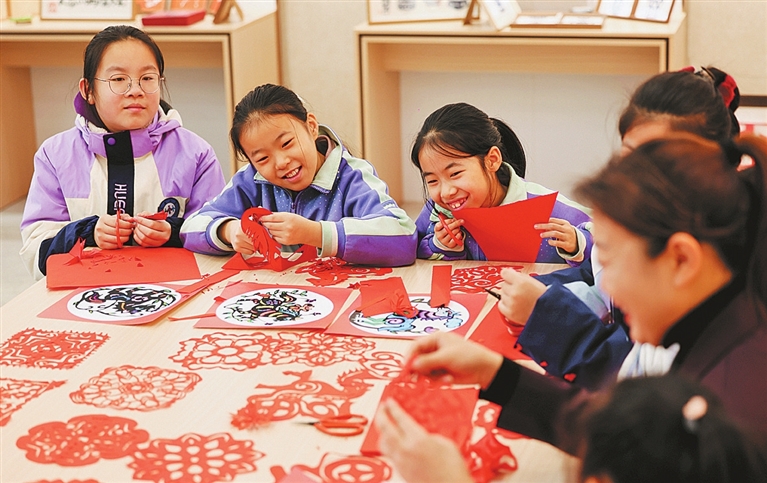 2025年12月30日,河北省石家庄市天苑小学学生在非遗剪纸课堂上学习剪纸技艺。元旦将至,全国多地学校和幼儿园举办丰富多彩的校园活动,让孩子们在快乐喜庆中迎接新年的到来。