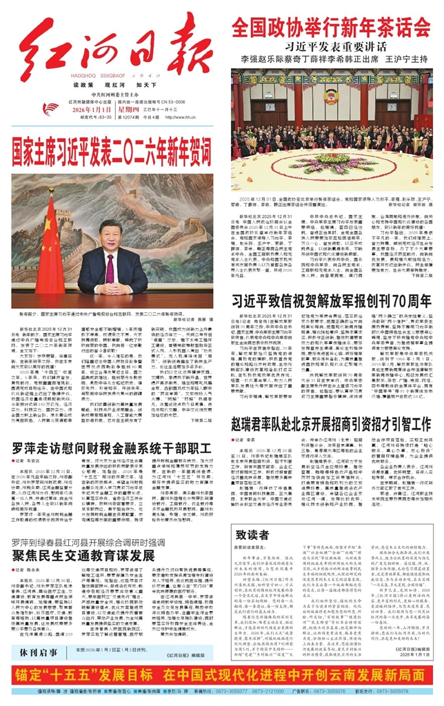 - 致读者 亲爱的读者朋友: 新年肇启,万象维新。值此元旦佳节,我们怀着深深的谢意与对未来的憧憬,与您共同展开2026年的崭新卷轴。 回望来路,《红河日报》作为州委机关报,始终坚守初心、守正创新,在纸