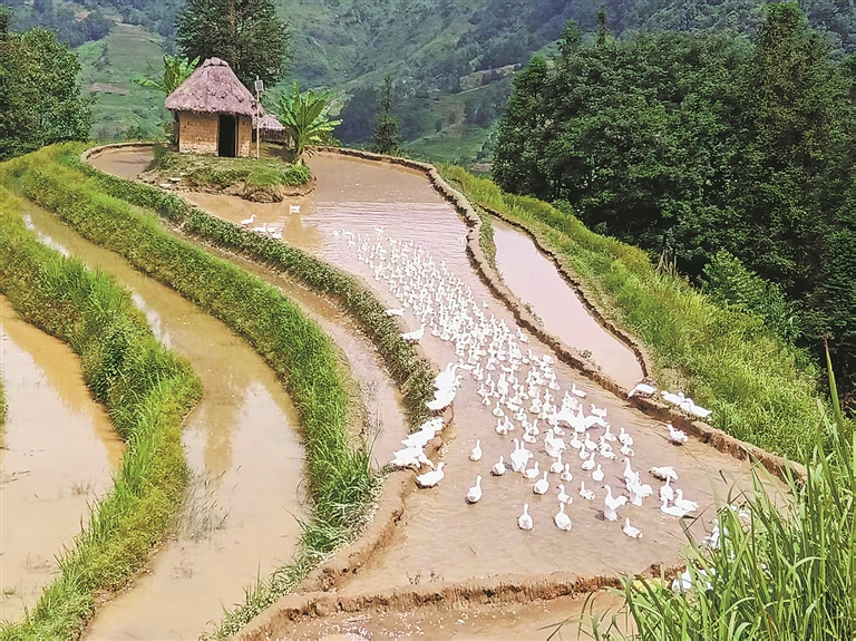 “鸭子在梯田里捕虫食草,还能帮稻田除虫、除草、增肥,实现经济、生态双赢。”元阳县畜牧技术推广站高级畜牧师曹文勇介绍,这种生态养殖模式,在守护千年梯田农耕系统的同时,也显著提升了产品品质,为产业可持续发展奠定了坚实基础。