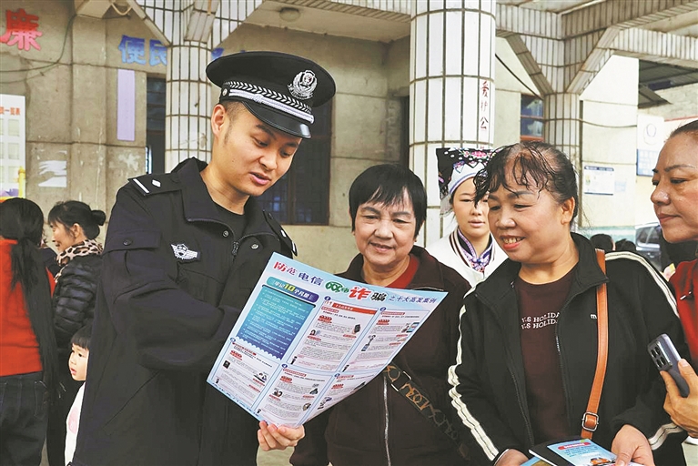 近日,由河口县委宣传部、县公安局、县科协等10个部门组成的志愿服务队走进南溪镇四二九社区,将科学普及、法治关怀、非遗体验“打包”送至群众“家门口”。图为工作人员为群众讲解反诈知识。