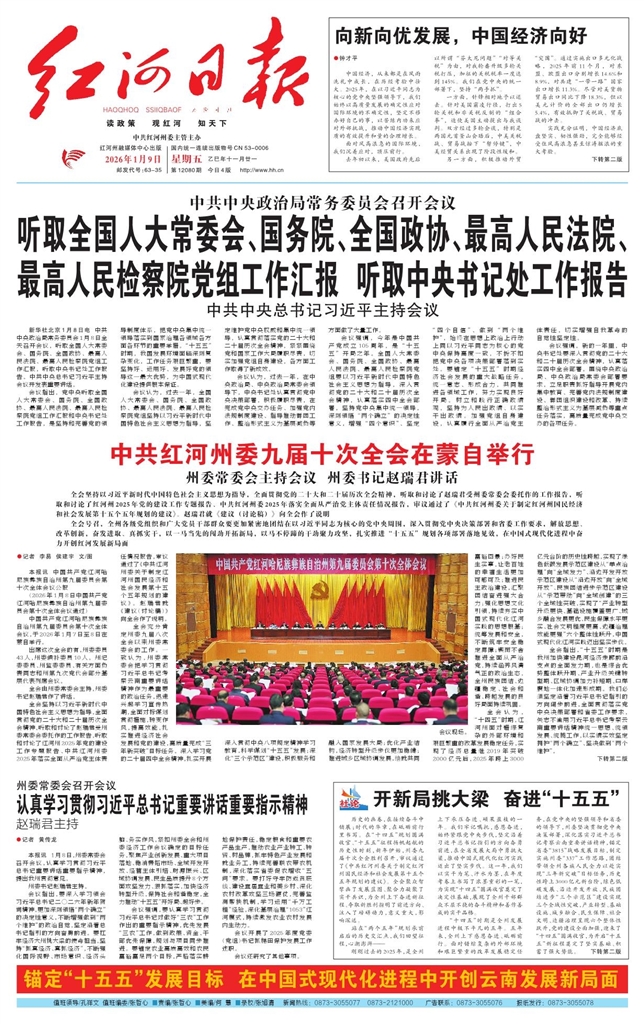 - 中共红河州委九届十次全会在蒙自举行 ●记者 李易 侯建宇 文/图 本报讯 中国共产党红河哈尼族彝族自治州第九届委员会第十次全体会议公报 (2026年1月8日中国共产党红河哈尼族彝族自治州第九届委员会第十次全体会议通过)
