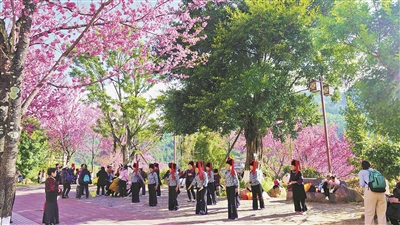 时下,绿春县山谷间的冬樱花竞相绽放。从山腰到山顶,层层叠叠的粉红花簇似暖雾轻笼、如胭脂晕染,鲜活又轻薄。樱花树下,身着民族服饰的阿妈们翩跹起舞、摄影爱好者踮脚举镜,定格这烂漫盛景。图为群众在樱花树下享受美好时光。