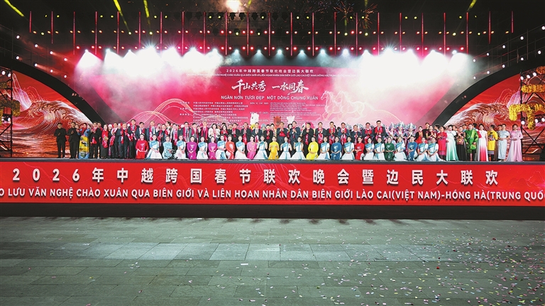 本报讯 共庆千山秀,同享一江春。2月3日,2026年中越跨国春节联欢晚会暨边民大联欢活动在河口举行。中越两国演员携手献艺,为观众带来精彩的视听盛宴,续写两国友好篇章。