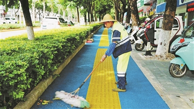 建水县把人居环境整治提升作为巩固国家卫生县城、推进健康县城建设的重要抓手,大力实施城市道路清扫保洁,推进城市公厕及洗手台精细化管理,有效提升了城市品质。图为环卫工人在清扫街道。