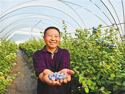 “‘622’联农带农模式,即由农户成立家庭农场,投入土地、大棚、农资用品,并进行日常管理。”万葵介绍,村集体企业为农户购买苗木、改造棚膜、建设水肥系统;龙头企业负责提供苗源、技术指导、市场销售。最终,蓝莓销售收入按照农户60%、村集体企业20%、龙头企业20%的比例进行分配。