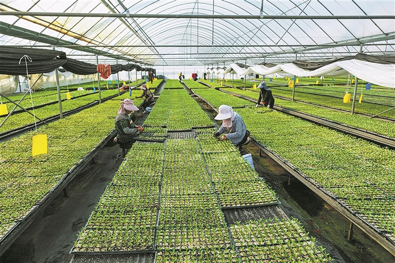 近年来,蒙自市充分发挥现代农业科技示范作用,积极引进优质育苗企业,建设标准化育苗基地,结合市场需求实行订单培育,推动当地农业提质增效,带动群众增收致富。图为工人在蒙自市草坝镇春晓种苗基地管护辣椒苗。