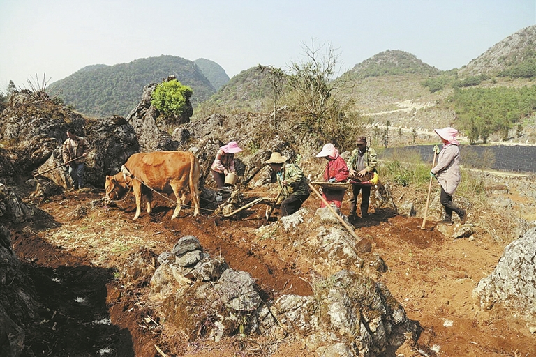 走进泸西县向阳乡旧寨村委会路新村民小组田间,只见村民在田地间来回穿梭,翻耕、播种、施肥、覆土……各个环节有条不紊。