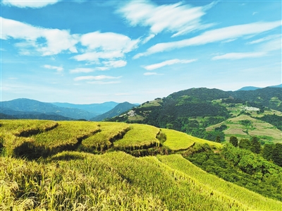 近日,绿春县1.79万亩旱地优质稻渐次成熟,即将迎来丰收,预计总产量超8000吨。图为三猛乡哈波村旱地优质稻种植基地的千亩稻田。