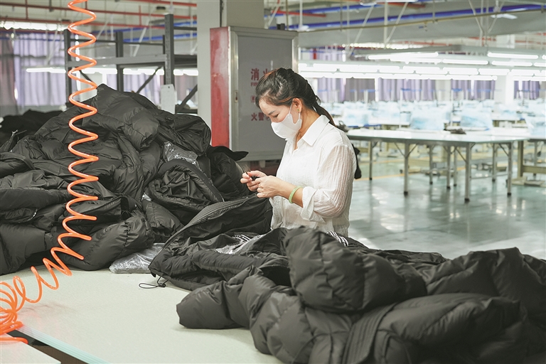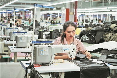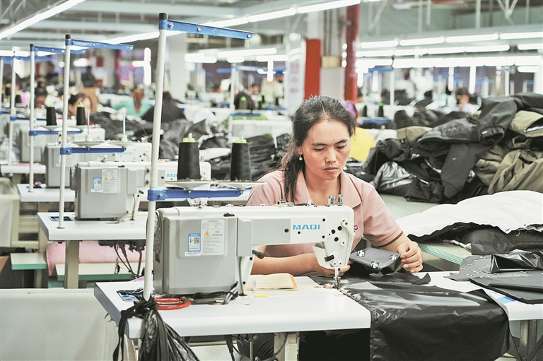 位于河口县的云南观品服装纺织产业园项目计划投资1亿元,预计可实现年产值约5亿元,可提供就业岗位6000个。项目一期已于2024年12月投产,开设生产线5条,截至目前,已试生产羽绒服1.7万件。该项目不仅为当地群众就业提供了有力支撑,还吸引了很多越南籍工人到此务工,为我州轻纺加工产业发展和高水平对外开放注入新动力。图为工人在生产线上工作。
