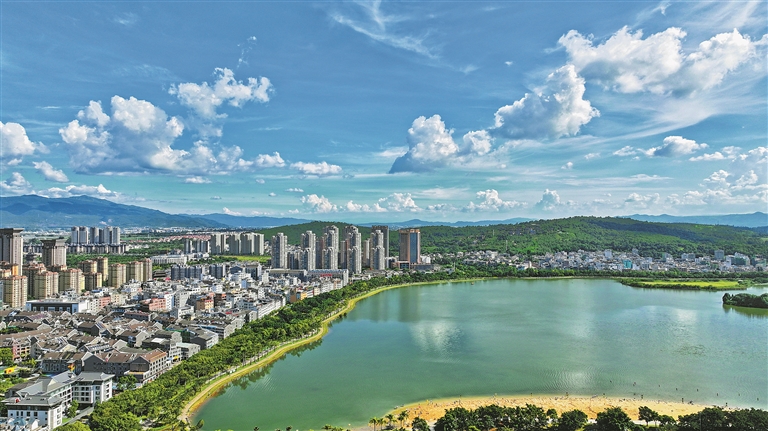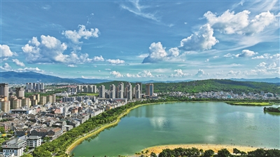 初秋时节,“滇中花园”弥勒市蓝天如洗,吸引数万游客与市民共赏云卷云舒。6座专类园与25座口袋公园星罗棋布,满足多元休闲需求,市民推窗即见绿意。图为弥勒市湖泉生态园湖面如镜。