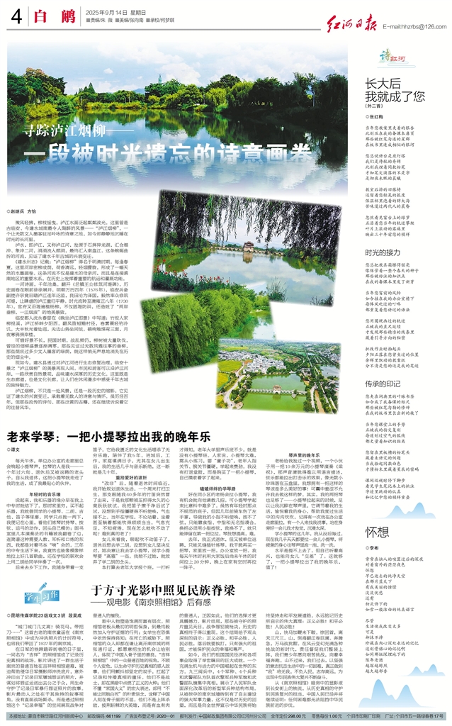 - 长大后我就成了您(外二首) ◎张红梅 当年您教案里夹着的银杏 此刻压在我的备课本扉页 那些被红笔勾连的星群 在板书里连成相似的银河 您总说讲台是座灯塔 我们是待航的舟楫 此刻我捏着同款粉笔 才