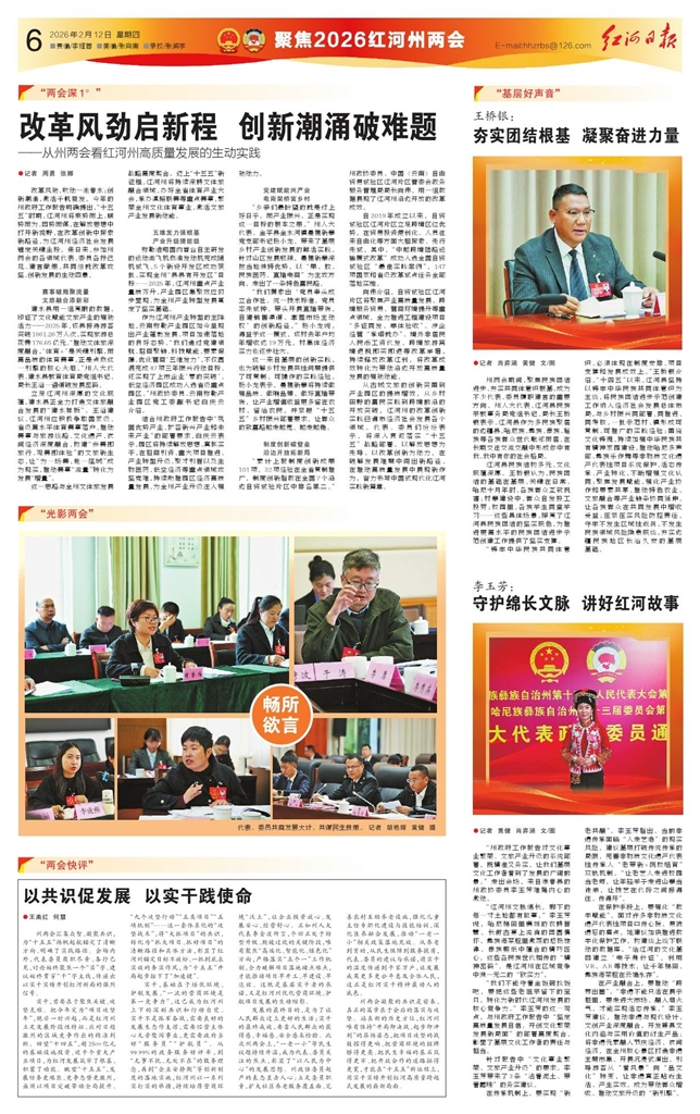 - 守护绵长文脉 讲好红河故事 ●记者 黄健 肖弈涵 文/图 “州政府工作报告对文化事业繁荣、文旅产业升级的系统部署,既精准又务实,让我们基层文化工作者看到了发展的广阔前景。”走出会场,来自绿春县的州政协委员李玉芳难掩内心的
